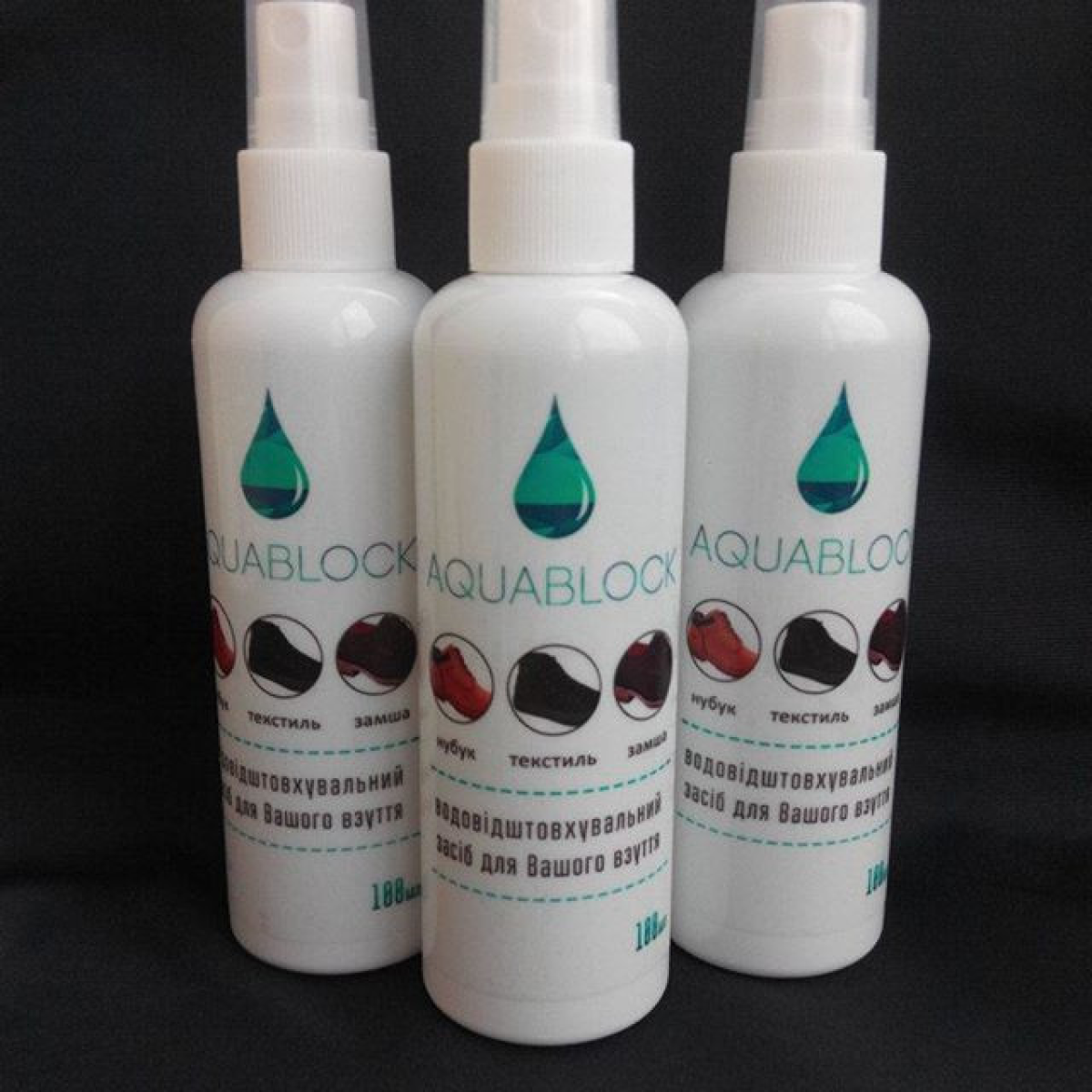 ЕФЕКТИВНИЙ ЗАСІБ для захисту вашого взуття та одягу від води і бруду з інноваційною технологією, яка формує всередині пор і на поверхні матеріалу не гладку, а розгалужену нанорозмірну структуру. Після обробки поверхні AQUABLOCKом утворюється невидиме покриття, яке надає вашому взутті та одязі унікальні водо - і грязе - відштовхуючі властивості, в результаті чого поверхня практично не взаємодіє з водою та її розчинами і володіє ефектом самоочищення без втрати повітропроникності. Дане революційний засіб є хімічно нейтральним і цілком нешкідливим. Легкий і простий у застосуванні.