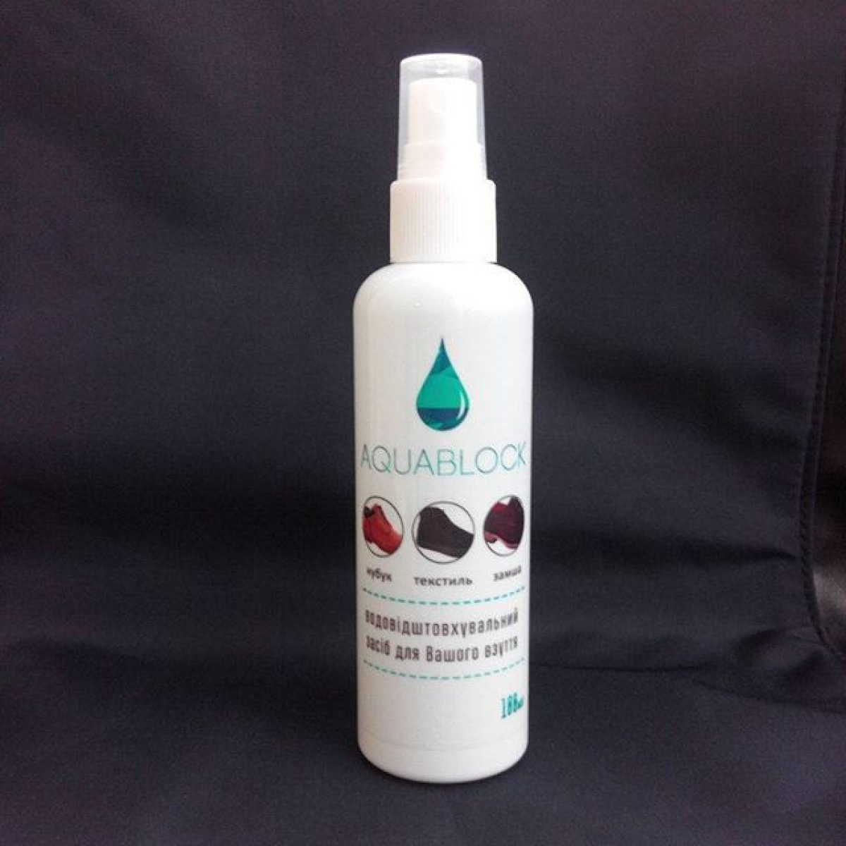 ЕФЕКТИВНИЙ ЗАСІБ для захисту вашого взуття та одягу від води і бруду з інноваційною технологією, яка формує всередині пор і на поверхні матеріалу не гладку, а розгалужену нанорозмірну структуру. Після обробки поверхні AQUABLOCKом утворюється невидиме покриття, яке надає вашому взутті та одязі унікальні водо - і грязе - відштовхуючі властивості, в результаті чого поверхня практично не взаємодіє з водою та її розчинами і володіє ефектом самоочищення без втрати повітропроникності. Дане революційний засіб є хімічно нейтральним і цілком нешкідливим. Легкий і простий у застосуванні.