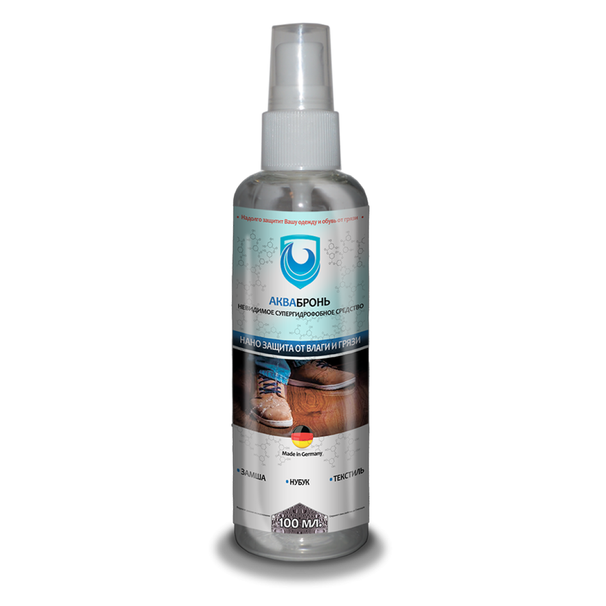 «АкваБронь» – це революційне водовідштовхувальне покриття, яке надає унікальні властивості таких матеріалів, як натуральна і штучна тканина, замша, нубук і інші. Даний засіб не токсичний, не містить органічних розчинників і абсолютно прозоро.