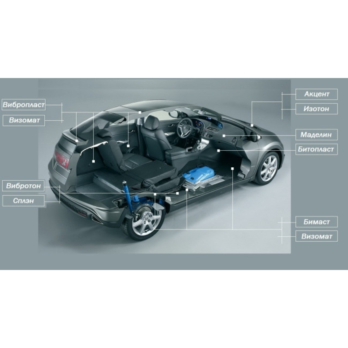 1. Мінімальний пакет — застосовується 1.5-міліметрову віброізоляцію, 4-міліметрову шумоізоляцію й антискрип.