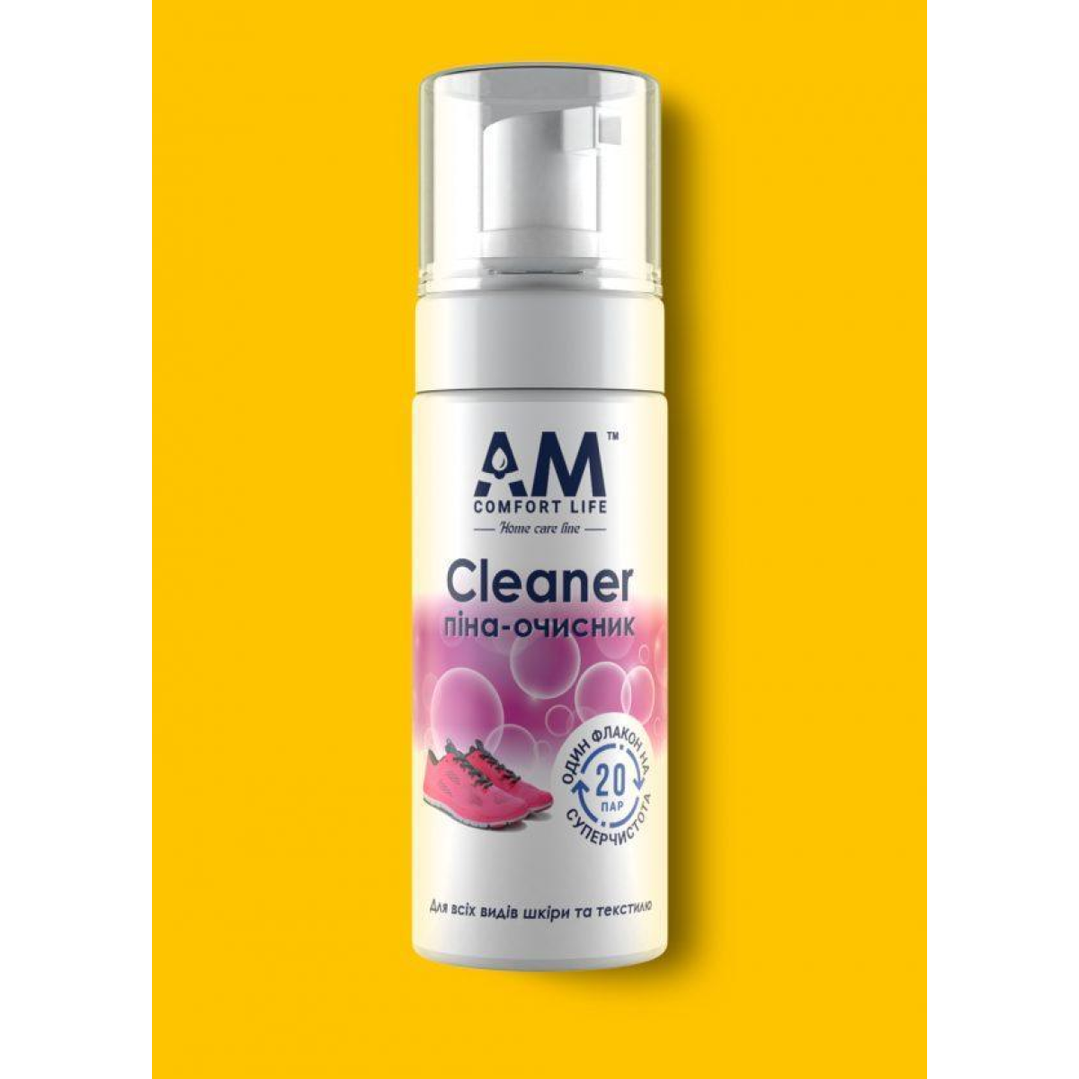 Cleaner піна-очищувач ТМ АМ. Ефективний засіб для видалення бруду і плям з поверхні одягу і взуття. Безпечно очищає вироби з гладкої шкіри, нубука, замші і тканини. Cleaner піна-очищувач швидко і легко очищає від забруднень поверхню, не змінюючи її колір і властивості. Має приємний запах, нешкідливий для навколишнього середовища. Зручний дозатор на флаконі дозволяє швидко наносити засіб.