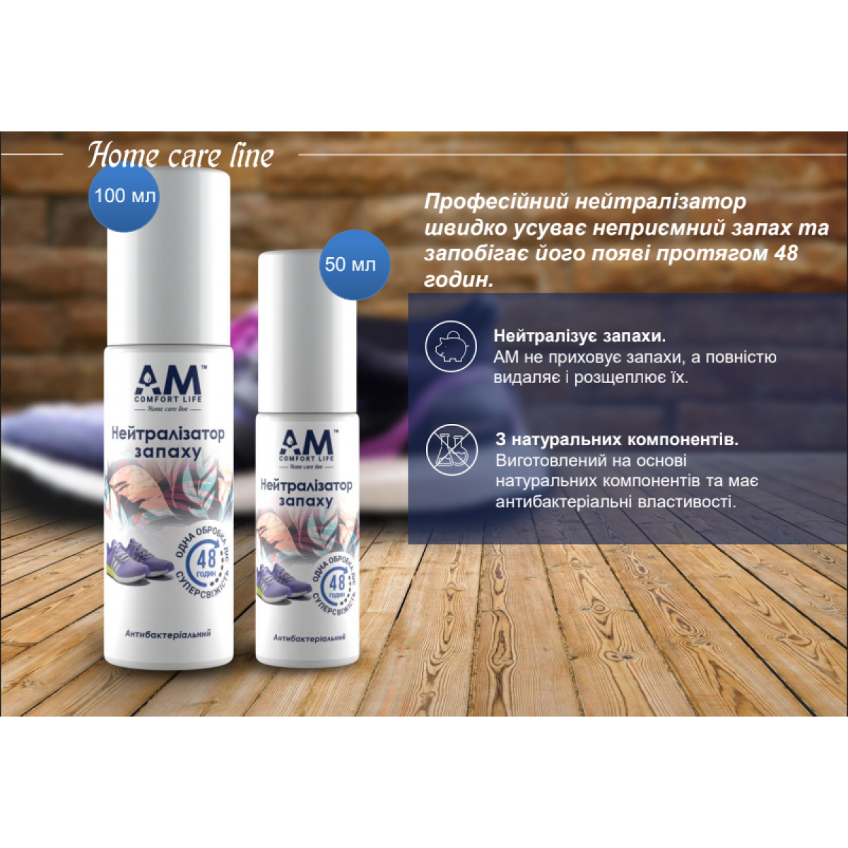 Нейтралізатор запаху (дезодорант) ТМ АМ. Антибактеріальний. Для взуття та одягу. Професійний нейтралізатор швидко усуває неприємний запах і запобігає його появі впродовж 48 годин. АМ не приховує запахи, а повністю видаляє та розщеплює їх. Характерна відмінність засобу в тому, що він виготовлений на основі натуральних компонентів і має антибактеріальні властивості. Абсолютно безпечний для людей, тварин і довкілля. АМ піклується про ваш комфорт.