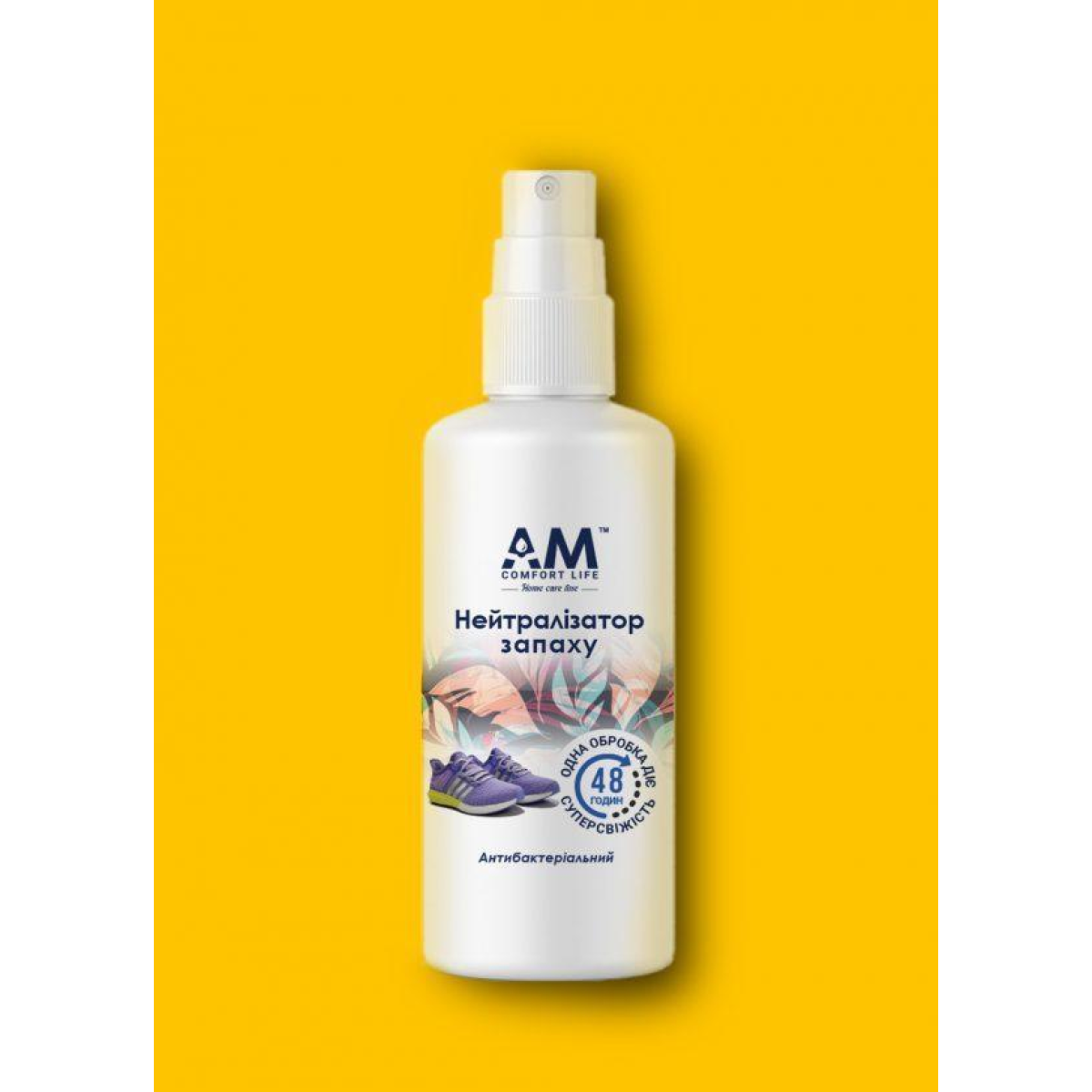 Нейтралізатор запаху (дезодорант) ТМ АМ. Антибактеріальний. Для взуття та одягу. Професійний нейтралізатор швидко усуває неприємний запах і запобігає його появі впродовж 48 годин. АМ не приховує запахи, а повністю видаляє та розщеплює їх. Характерна відмінність засобу в тому, що він виготовлений на основі натуральних компонентів і має антибактеріальні властивості. Абсолютно безпечний для людей, тварин і довкілля. АМ піклується про ваш комфорт.