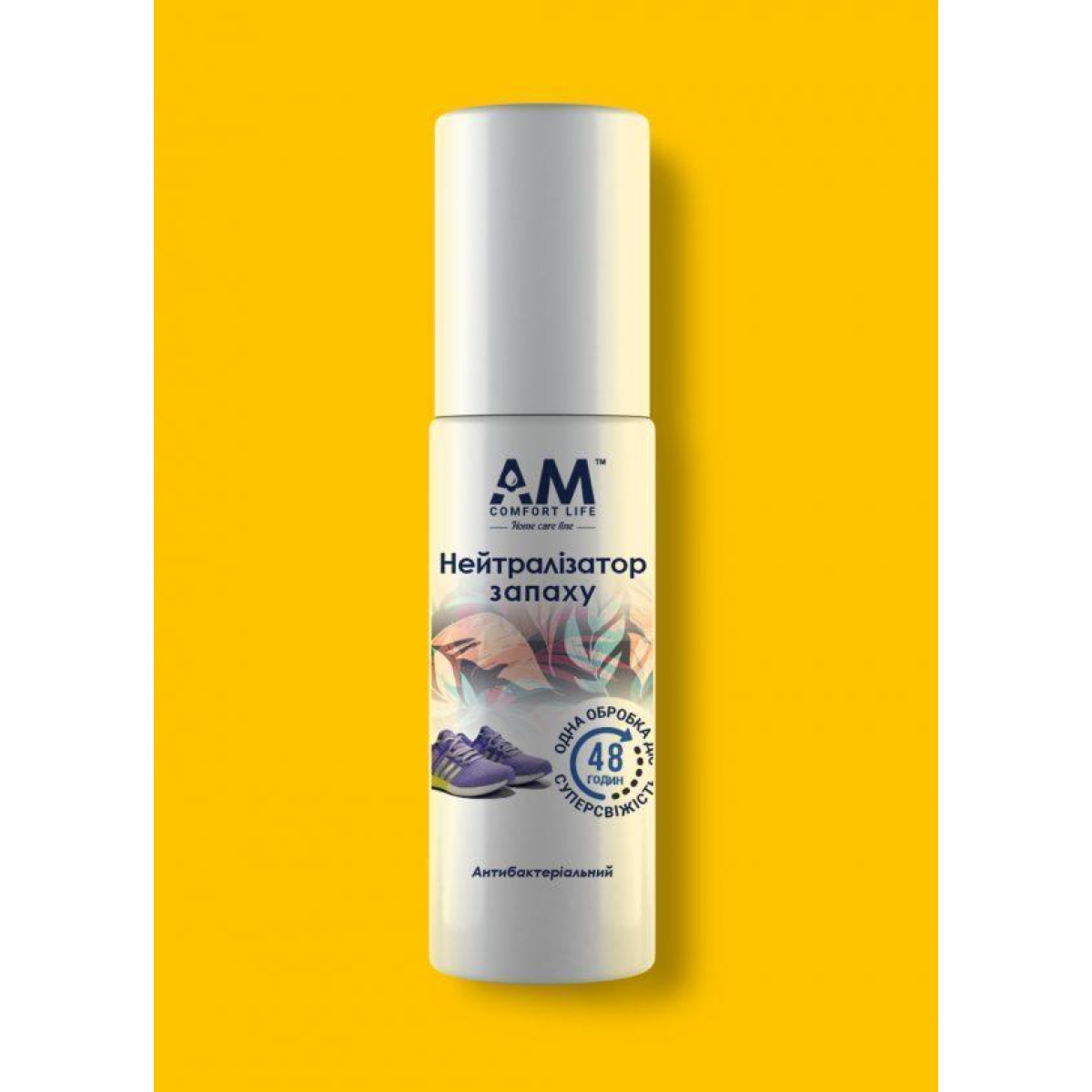 Нейтралізатор запаху (дезодорант) ТМ АМ. Антибактеріальний. Для взуття та одягу. Професійний нейтралізатор швидко усуває неприємний запах і запобігає його появі впродовж 48 годин. АМ не приховує запахи, а повністю видаляє та розщеплює їх. Характерна відмінність засобу в тому, що він виготовлений на основі натуральних компонентів і має антибактеріальні властивості. Абсолютно безпечний для людей, тварин і довкілля. АМ піклується про ваш комфорт.