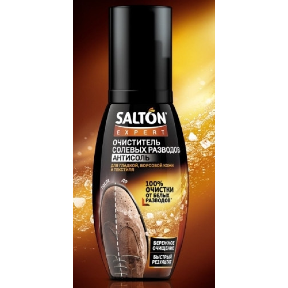 Забезпечує швидке та ефективне видалення розводів від соли и реагентів з поверхні взуттєвих виробів. Підходить для взуття всіх кольорів з замші, нубуку, велюру, гладкої шкіри та текстиля.