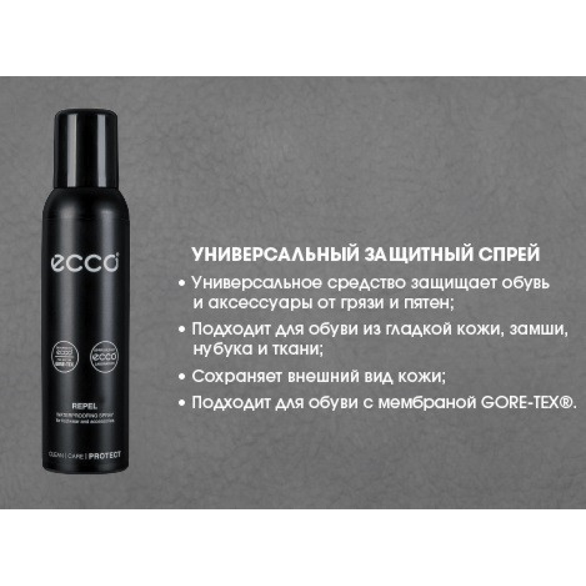 ECCO Repel — водовідштовхувальний спрей для захисту та догляду за гладкою шкірою, замшею, нубуком, текстильними матеріалами. Забезпечує оптимальний захист від вологи. Регулярне використання оптимізує захисний ефект. Підходить для виробів із мембранних матеріалів.