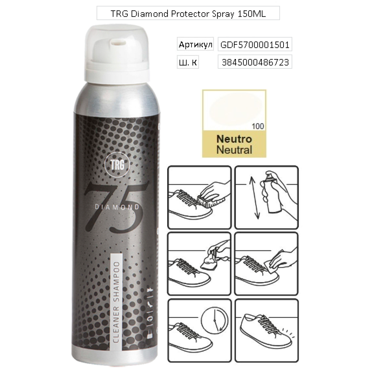 Водовідштовхувальне просочення для взуття TRG 75 Diamond Protector забезпечує ефективний захист від вологи та забруднень виробів зі шкіри, текстилю, сучасних високотехнологічних матеріалів. Засіб продовжує термін експлуатації та сприяє збереженню первинного зовнішнього вигляду виробів; не змінює натуральний колір і властивості шкіри, не забиває пори матеріалу. Продукт тестований і рекомендований компанією W. L. Gore and Associetes для догляду за взуттям, виготовленим із мембранної тканини Gore-Tex.