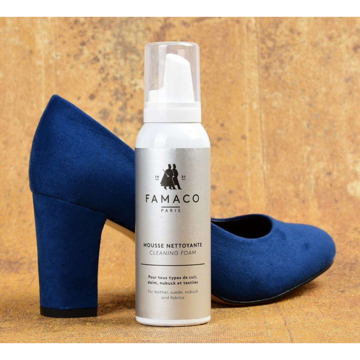 Пінка Famaco Mousse Nettoyante — засіб для делікатного чищення виробів із гладкої шкіри, замші, нубуку та текстилю від плям (зокрема жирних). Крім очисного ефекту, робить матеріал м“яким і зволоженим, а кольори — яскравими та насиченими. Головна перевага пінки перед іншими очисниками — немає потреби використання води та, як результат, менші тимчасові витрати на висихання обробленого виробу. Ще одна особливість очисника — після його застосування на матеріалі не залишається слідів і розводів.