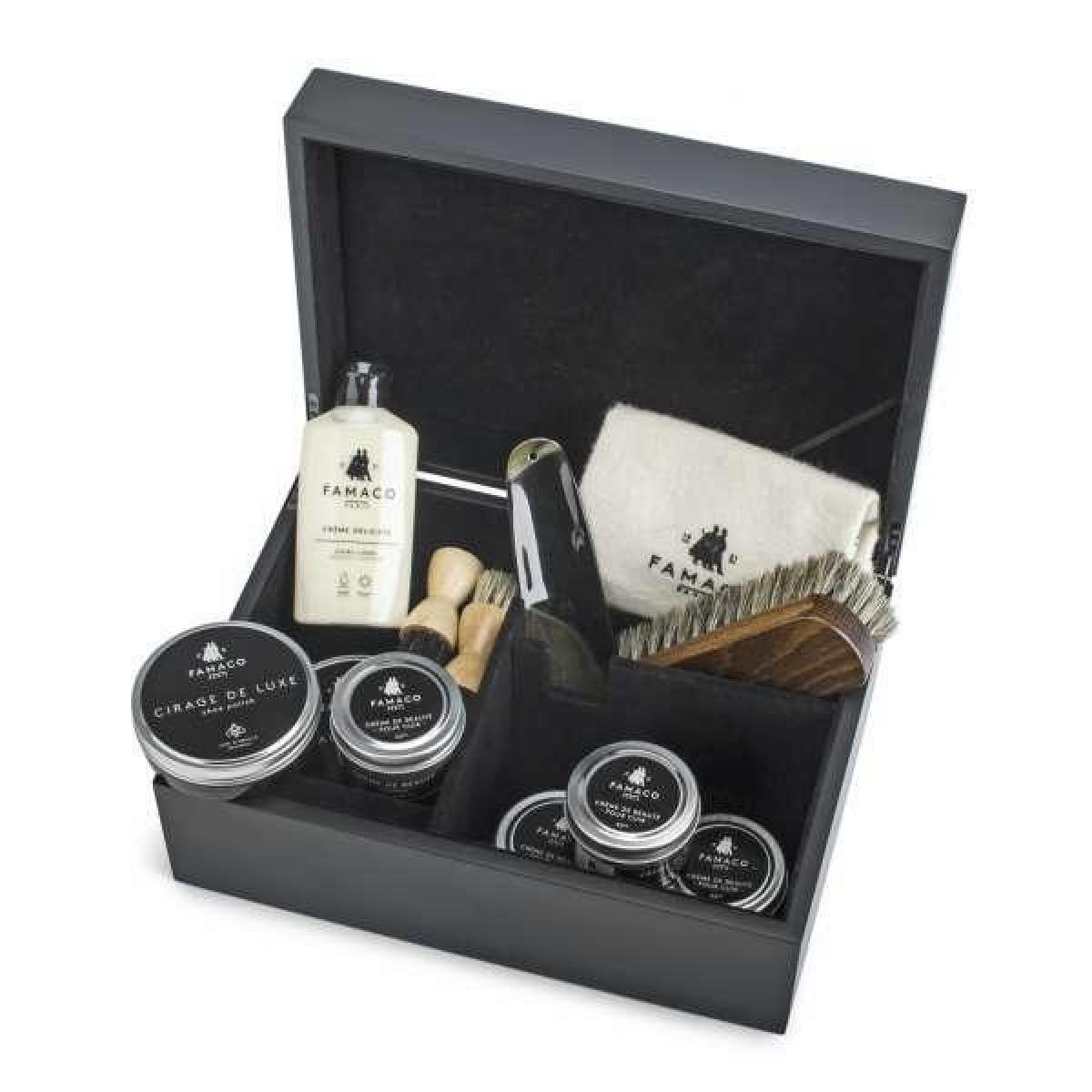Набір для догляду за взуттям Famaco Box XS. У наборі представлені всі необхідні косметичні засоби Famaco для догляду за взуттям. Крем для взуття, щітки, ріжок і серветка (необхідний аксесуар для шкіри).