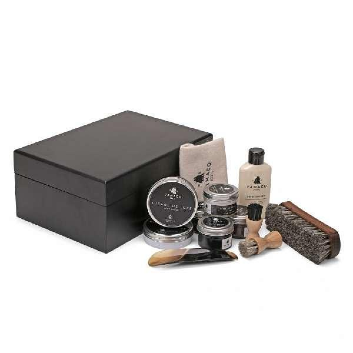 Набір для догляду за взуттям Famaco Box XS. У наборі представлені всі необхідні косметичні засоби Famaco для догляду за взуттям. Крем для взуття, щітки, ріжок і серветка (необхідний аксесуар для шкіри).