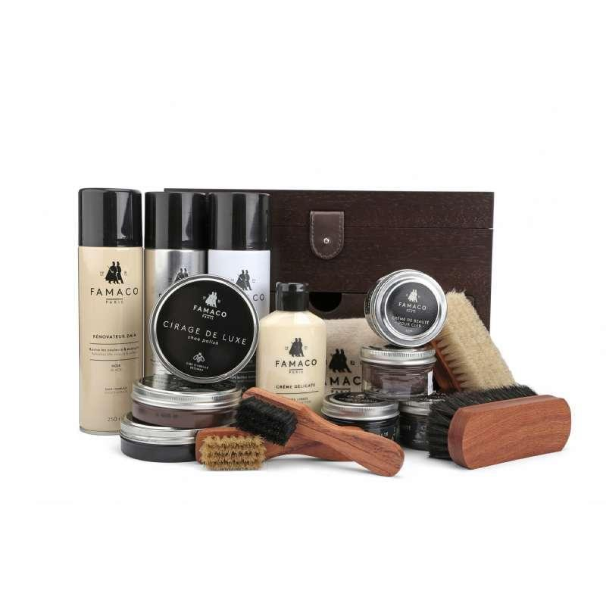 Розкішний подарунковий набір для догляду за взуттям Famaco в темно-коричневому футлярі.