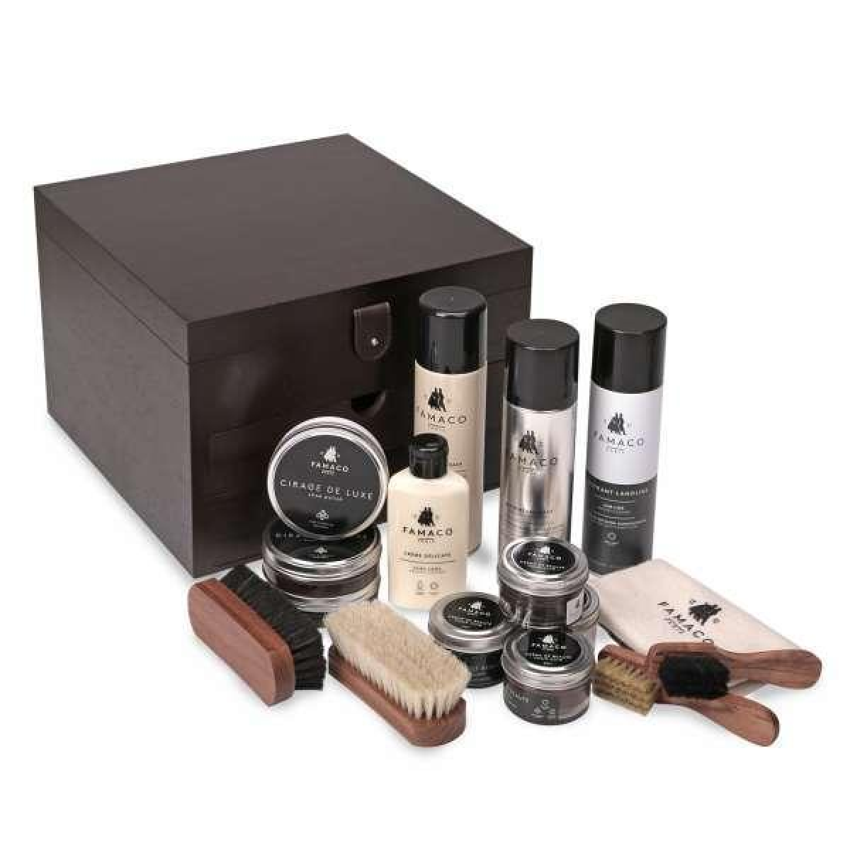 Розкішний подарунковий набір для догляду за взуттям Famaco в темно-коричневому футлярі.