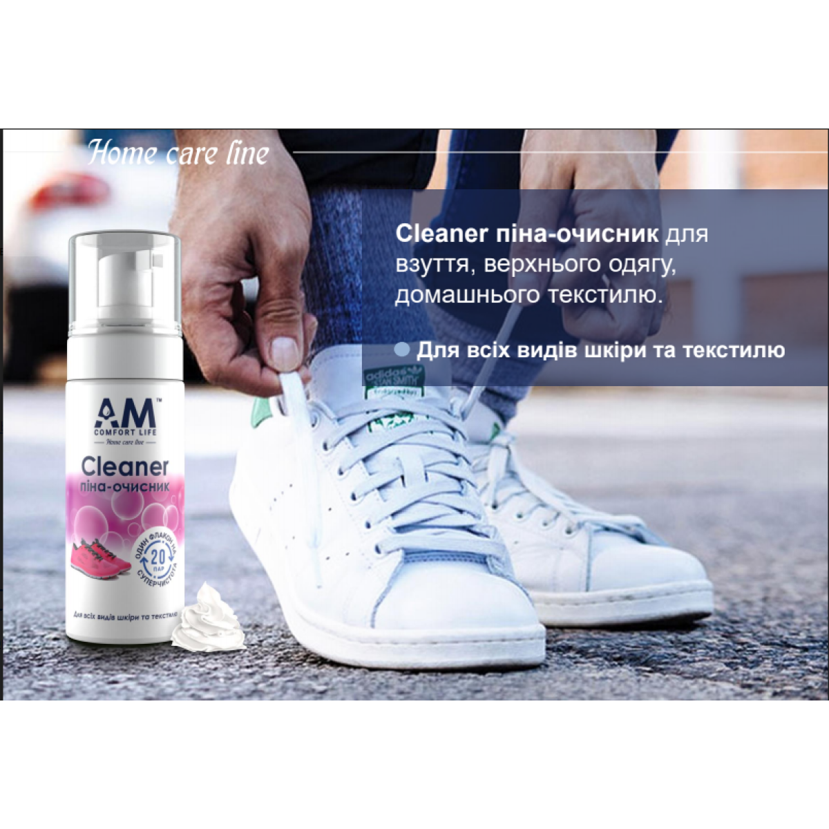 Cleaner піна-очищувач ТМ АМ. Ефективний засіб для видалення бруду і плям з поверхні одягу і взуття. Безпечно очищає вироби з гладкої шкіри, нубука, замші і тканини. Cleaner піна-очищувач швидко і легко очищає від забруднень поверхню, не змінюючи її колір і властивості. Має приємний запах, нешкідливий для навколишнього середовища. Зручний дозатор на флаконі дозволяє швидко наносити засіб.