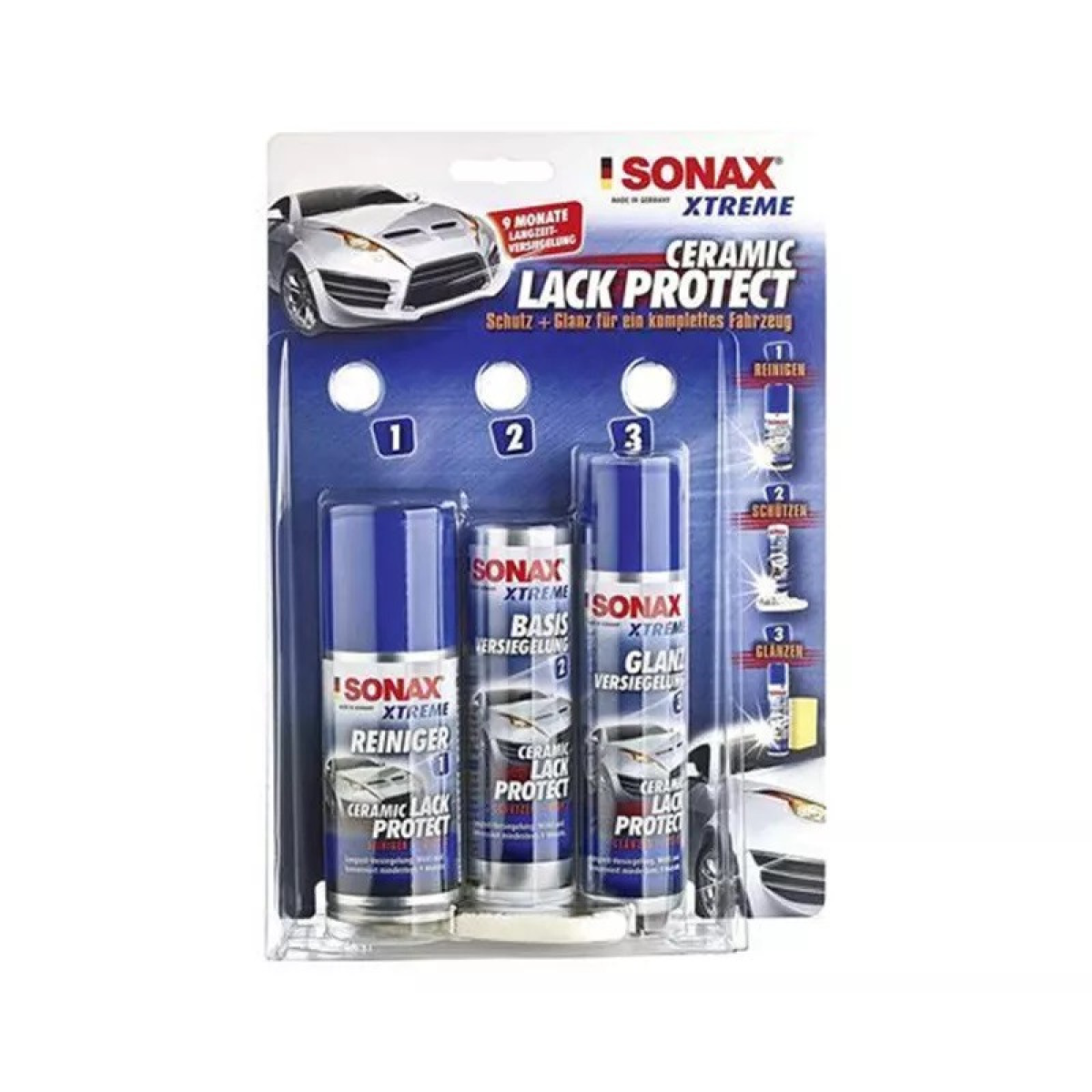 Набір для захисту лакофарбового покриття керамікою (рідкий склом) SONAX XTREME Ceramic Lackprotect (247941) дає змогу покрити фарбу автомобіля надзвичайно стійким і довговічним шаром і забезпечує чудовий перламутровий, глянсовий ефект. Фарба оптимально захищається, що неабияк знижує налипання бруду, комах і дорожньої солі. Ця властивість неабияк спрощує догляд за автомобілем. Прозора плівка підсилює колір, блиск фарби, вона стає ідеально гладкою з чудовим блиском.