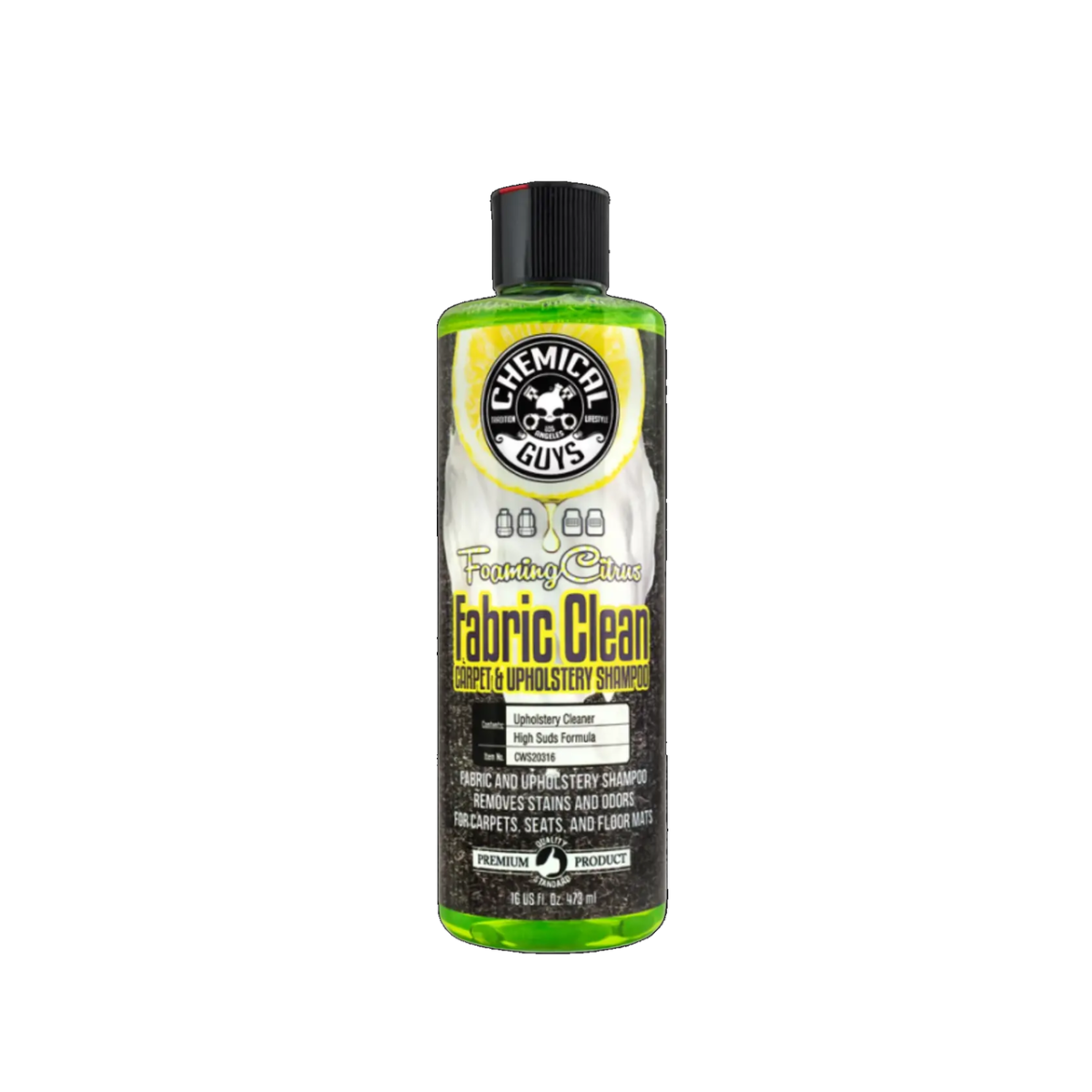 Chemical Guys Foaming Citrus Fabric Clean — концентрований очисник, призначений для глибокого очищення килимових покриттів та інших тканинних елементів салону. У його складі немає аміаку, вибілювачів, розчинників, які можуть пошкодити колір тканинних волокон, та інших агресивних детергентів. Активні компоненти — біорозкладні поверхнево-активні речовини (ПАВ) і ферментативні нейтралізатори запахів, які не просто маскують запахи, а усувають їх причину.