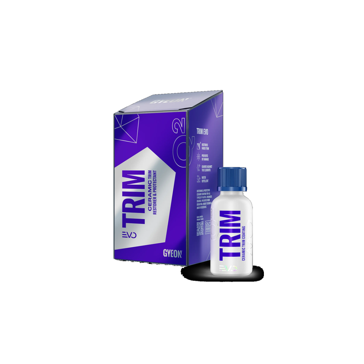 Gyeon Q2 Trim EVO — кварцове покриття тривалої дії для елементів із нефарбованого, прозорого та структурного пластику, вдосконалена версія Q² Trim. Воно приховує сліди старіння деталей із пластику, але також насичує глибоким кольором потьмянілі деталі кузова. А під час нанесення на пластикові фари зберігатиме їх прозорість. Оброблені елементи отримують захист від потемніння, блякнення і блякнення завдяки додаванню до формули УФ-фільтрів, так потужні гідрофобні властивості.