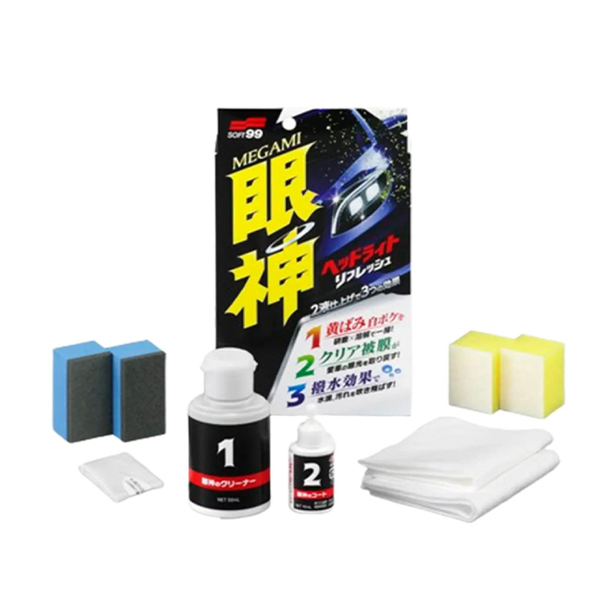 SOFT99 MEGAMI Headlight Refresh – набір для догляду за пластиковими фарами, що складається з очисника жовтизни та захисного кварцового покриття. Дає змогу повернути фарам заводську прозорість і блиск, захистити від подальшого блякнення, блякнення й пожовтіння, а також від негативного впливу агресивної автохімії та чинників довкілля.